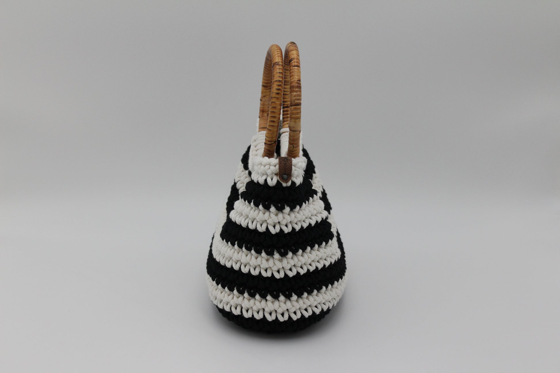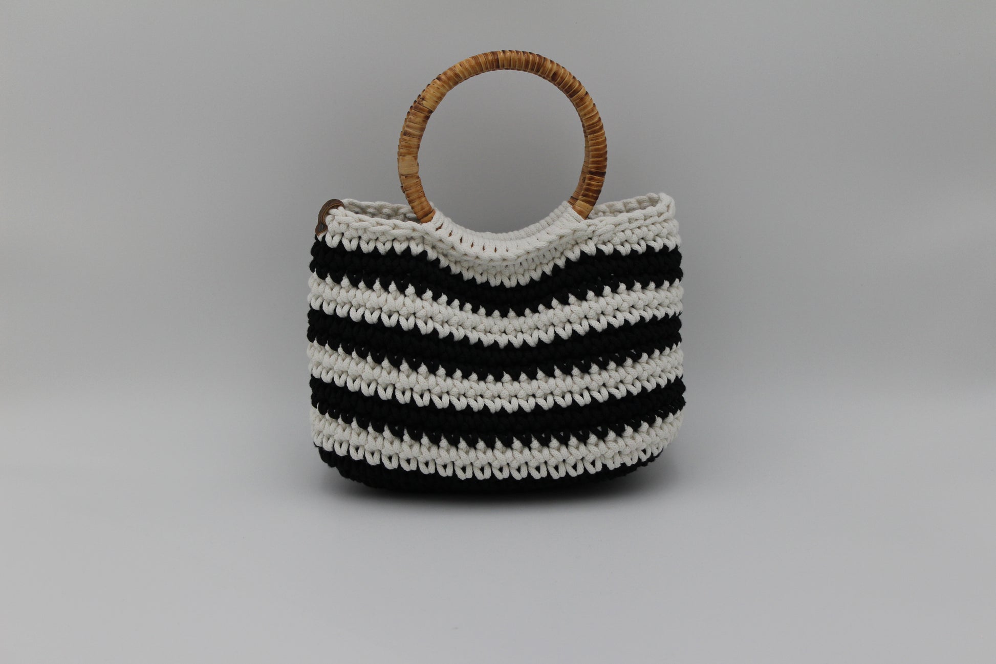 Ontdek onze Joan tas met kenmerkende rotan handvatten in het zwart/wit.